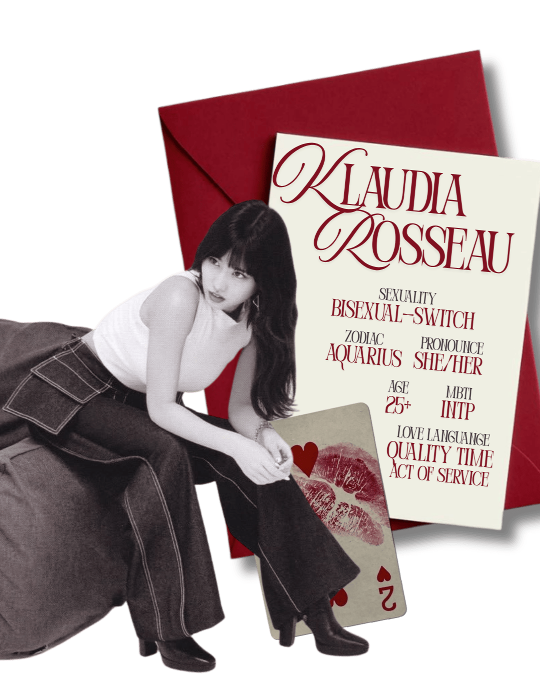 Klaudia Rosseau has two sides: one who blends in between distortions of rock guitar riffs and one who lives peacefully in a garden full of flowers. Do you want to toss a coin? See what side you'll get. Her presence is chaotic yet serene and comforting. Nonetheless, she may surprise you with tricks up her sleeves.Klaudia is a self-proclaimed independent girl (not really) in her mid-twenties who enjoys it when someone depends on her; she can be both a mature sister and a chaotic friend at the same time, which I think is one of her natural traits. She appreciates it when someone tells her even the smallest and insignificant things to her and she keeps them in her mind along other wonderful memories.She's not your typical bubbly girlfriend; she's a more laid-back person, and it shows in the way she behaves in the relationship; while she can be clingy and possesive at times, it's not excessive. She balances lovey-dovey with love-hate, and she will love you in her own unique ways.